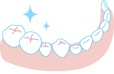 奥歯のかむ面や、前歯の裏側にある溝は、汚れがたまりやすく虫歯ができやすい大変危険な部位です。溝が細いところは歯ブラシの毛先より細く、日々の歯みがきでは汚れがとれません。
